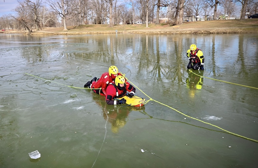 Evansville, Ind. — While many residents stayed away from frozen water, the Evansville Fire Department’s B-Shift Dive Team used the cold conditions at Garvin Park to train for ice rescue scenarios.